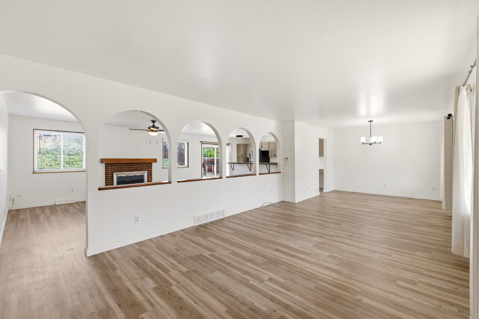 Huge front yard and backyard with no HOA - leaving lots of options for the next tenants. The front door opens to the extended front room with natural light and formal living and dining room with additional light, a wood fireplace a remodeled kitchen. Fridge, Microwave, Extended countertops, electric stove and lots of cabinet space.