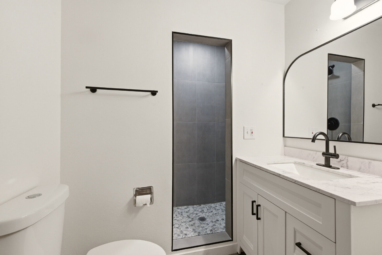 The hallway full bath has been remodeled top to bottom and is ready for brand new tenants. Two guest bedrooms and a large primary bedroom with fully updated ensuite primary bathroom. Primary bedroom has dual closet with extra space.
